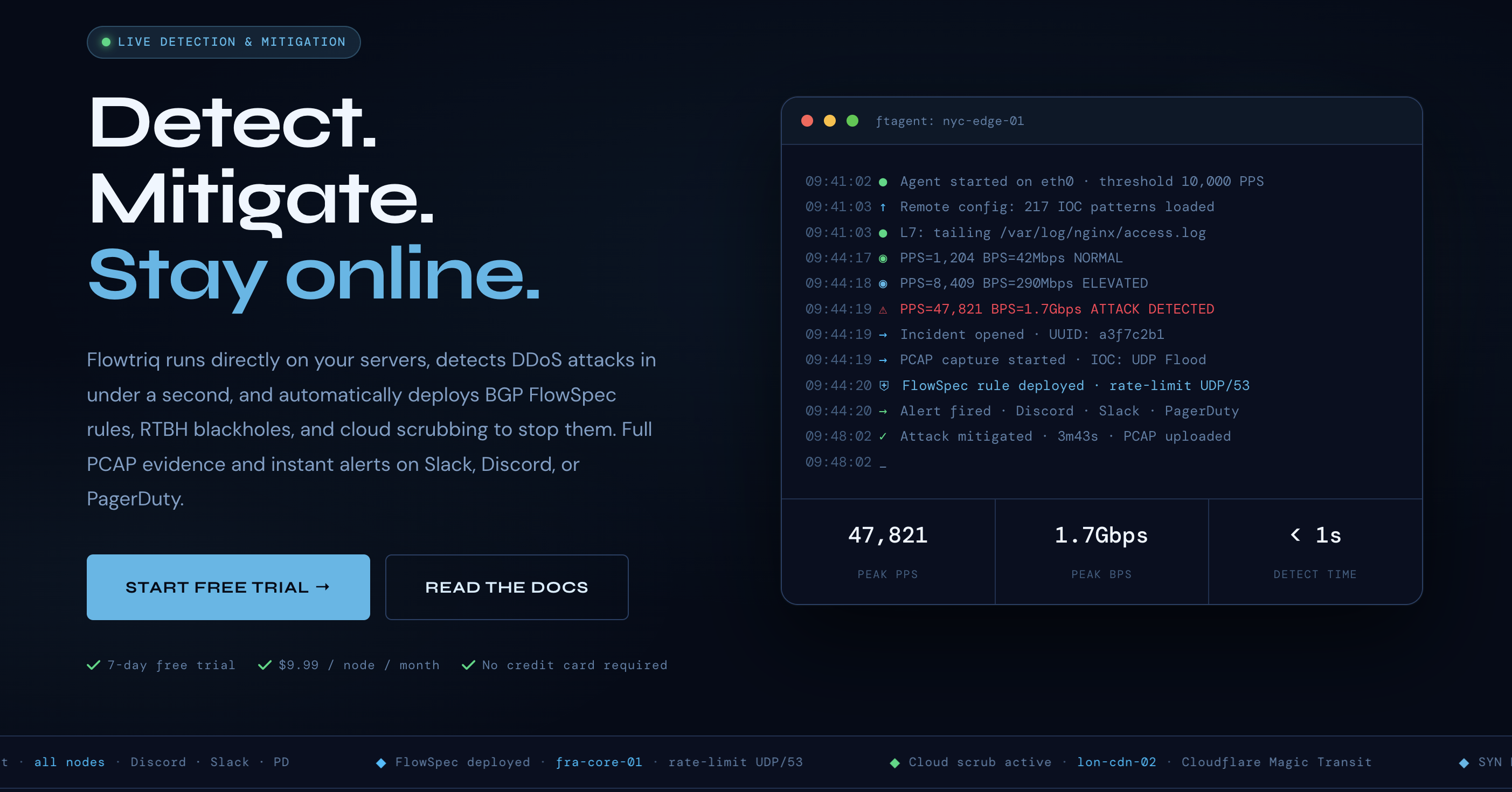 Most DDoS solutions sell drama: dashboards full of graphs, armies of rules, and invoices that scale with your traffic. Flowtriq is refreshingly boring in the best way — a tiny Linux agent that watches packets, learns what “normal” looks like, and flips auto-mitigation into play before your users notice. If you run game servers, a small hosting stack, or ML model endpoints that can’t tolerate minute-long outages, this is the practical alternative to big-cloud scrubbing bills and manual fiddling.